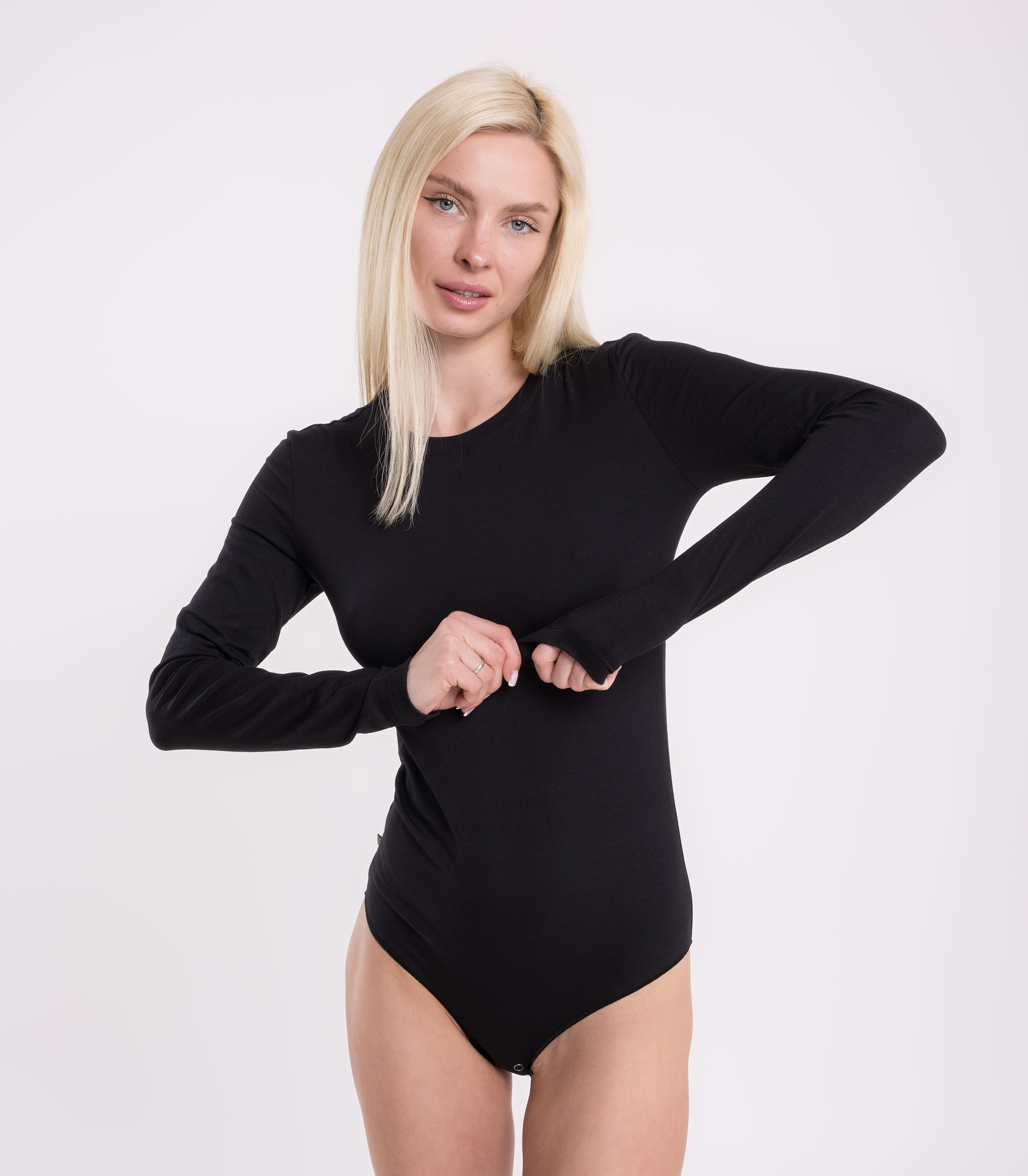 Женское боди с длинным рукавом и круглым вырезом горловины выполнено из высококачественного хлопка с добавлением эластана. Боди приталенного силуэто комфортно облегает тело. Модель с застежкой на кнопках;
