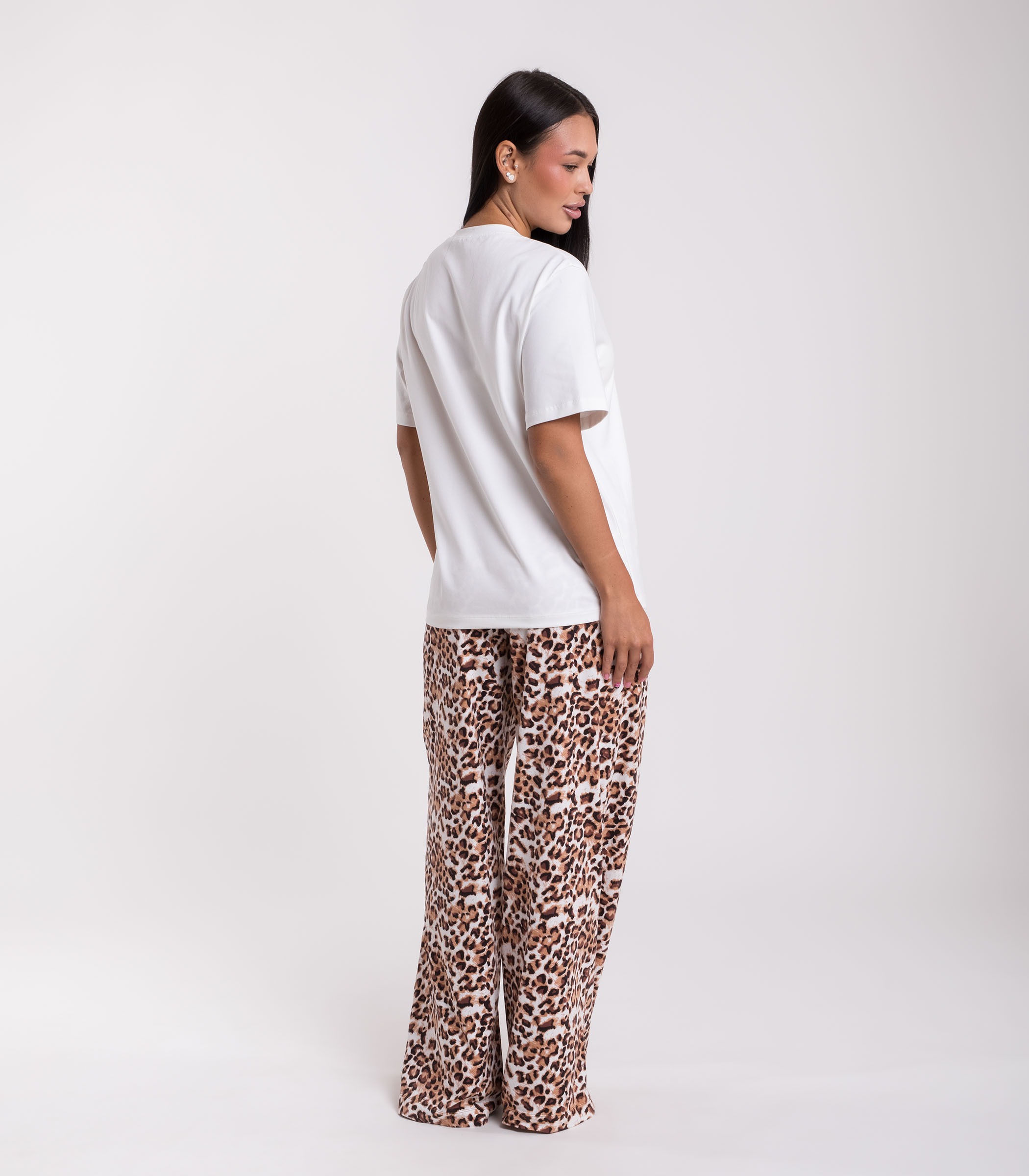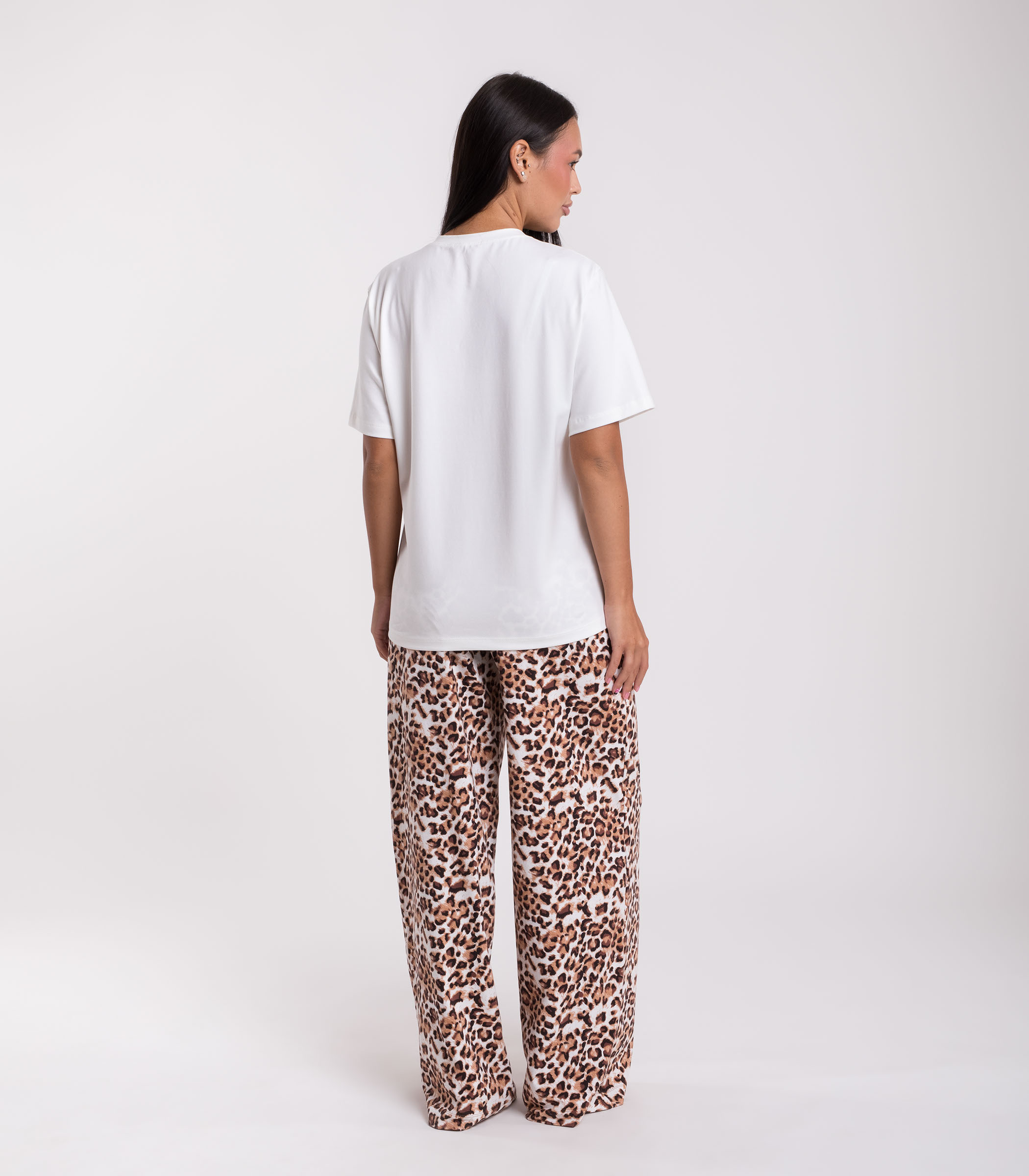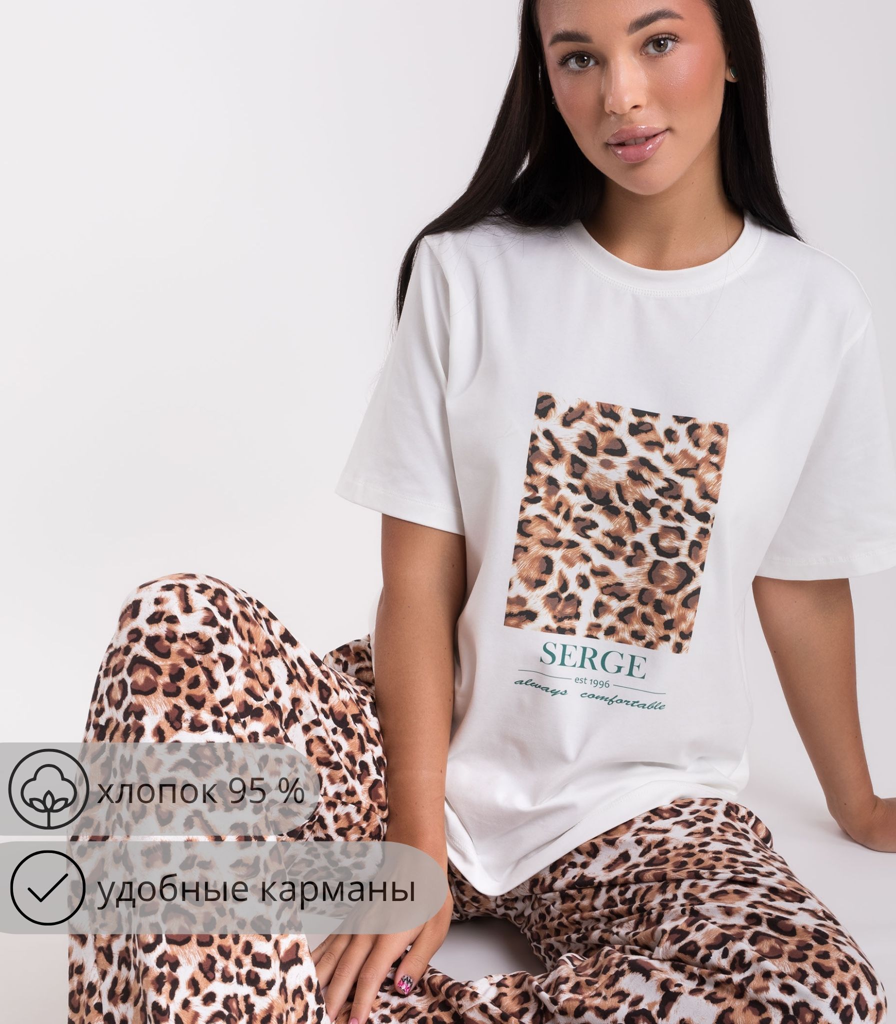 Стильный комплект для дома с принтом выполнен из высококачественного хлопкового полотна. Джемпер с короткими рукавами и брюки с комфортной мягкой резинкой на поясе. Натуральная мягкая ткань позволяет коже дышать и очень приятна на ощупь.;