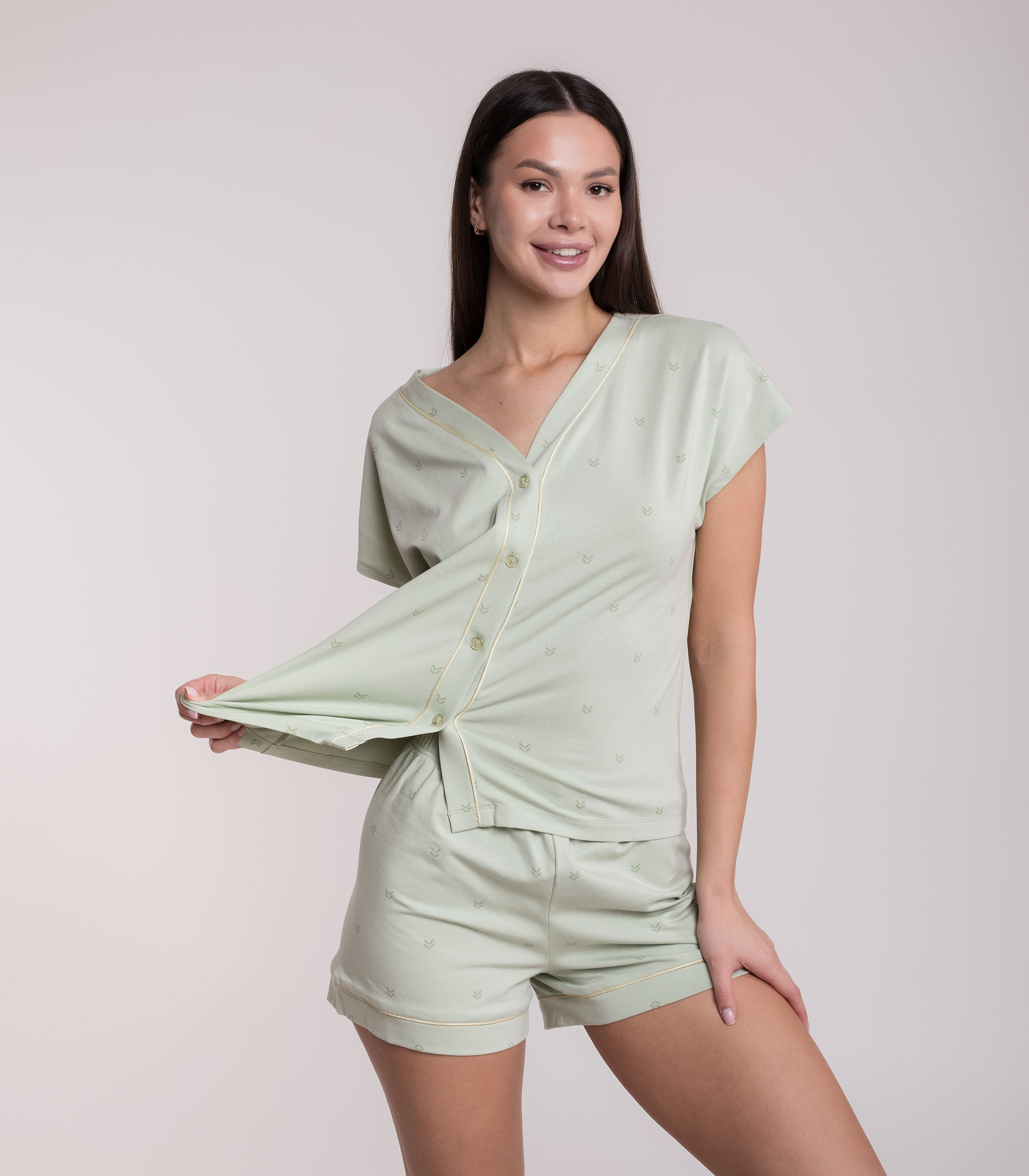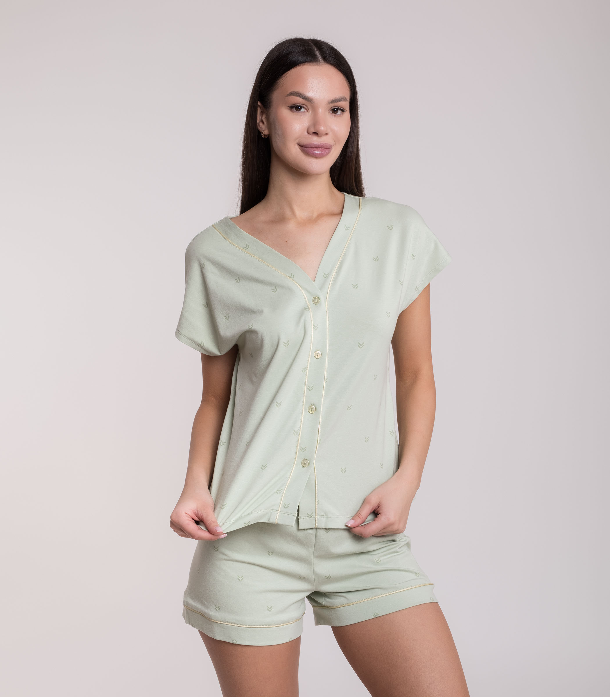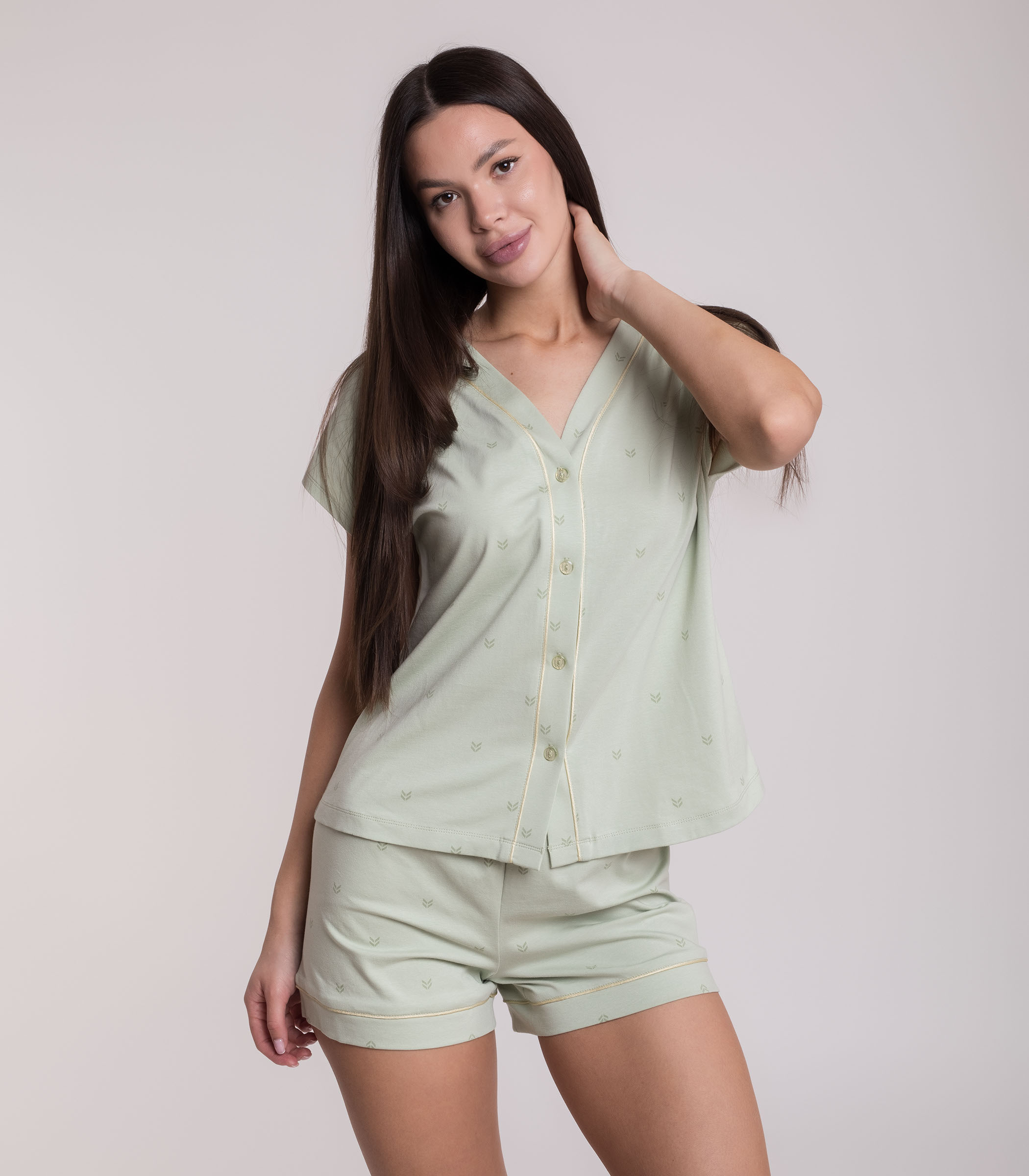 Комфортный комплект для домашнего отдыха выполнен из мягкого хлопкового полотна. Джемпер с коротким рукавом на пуговицах. Мини-шорты с мягкой резинкой на талии. Модель с контрастным кантом.