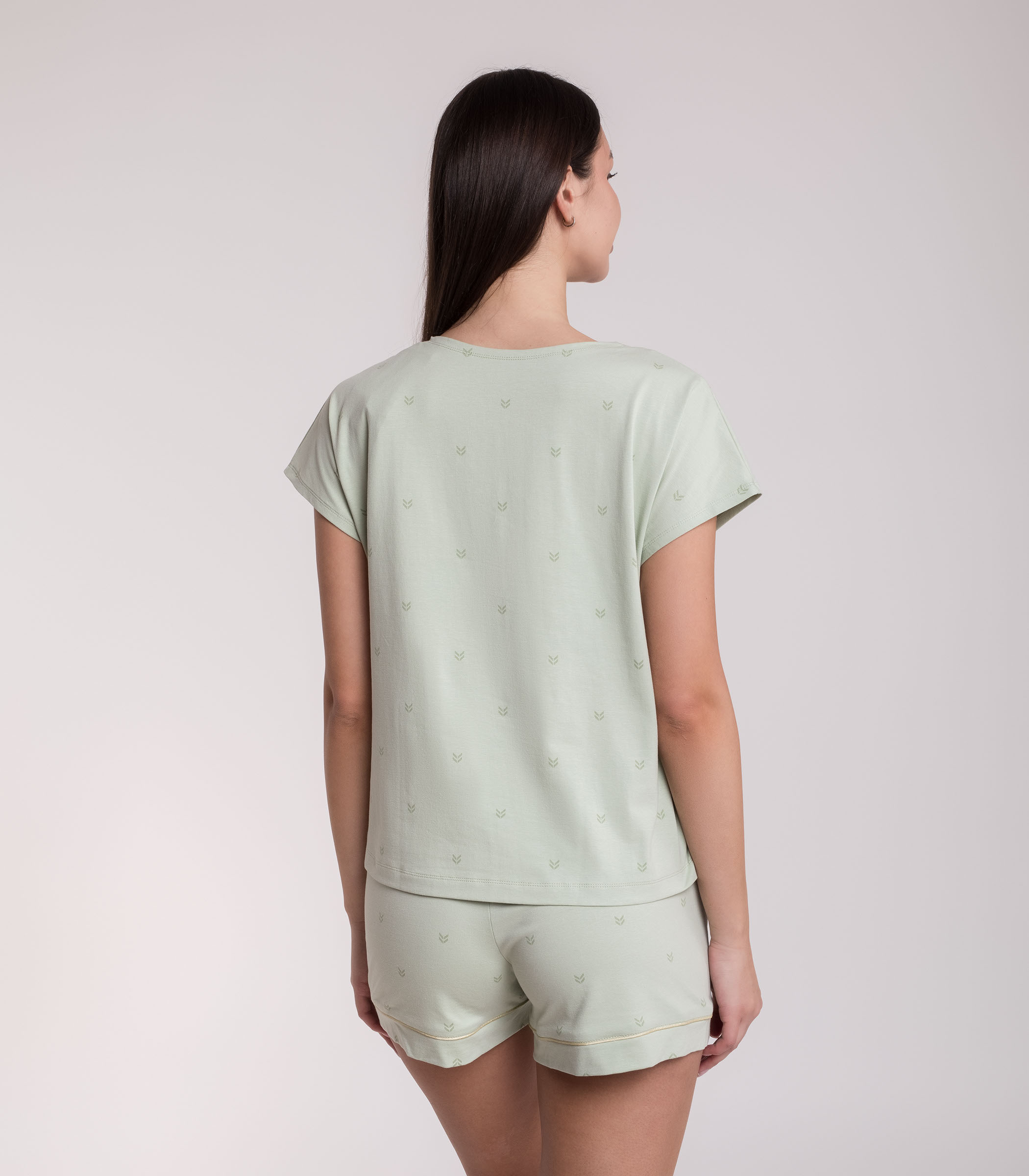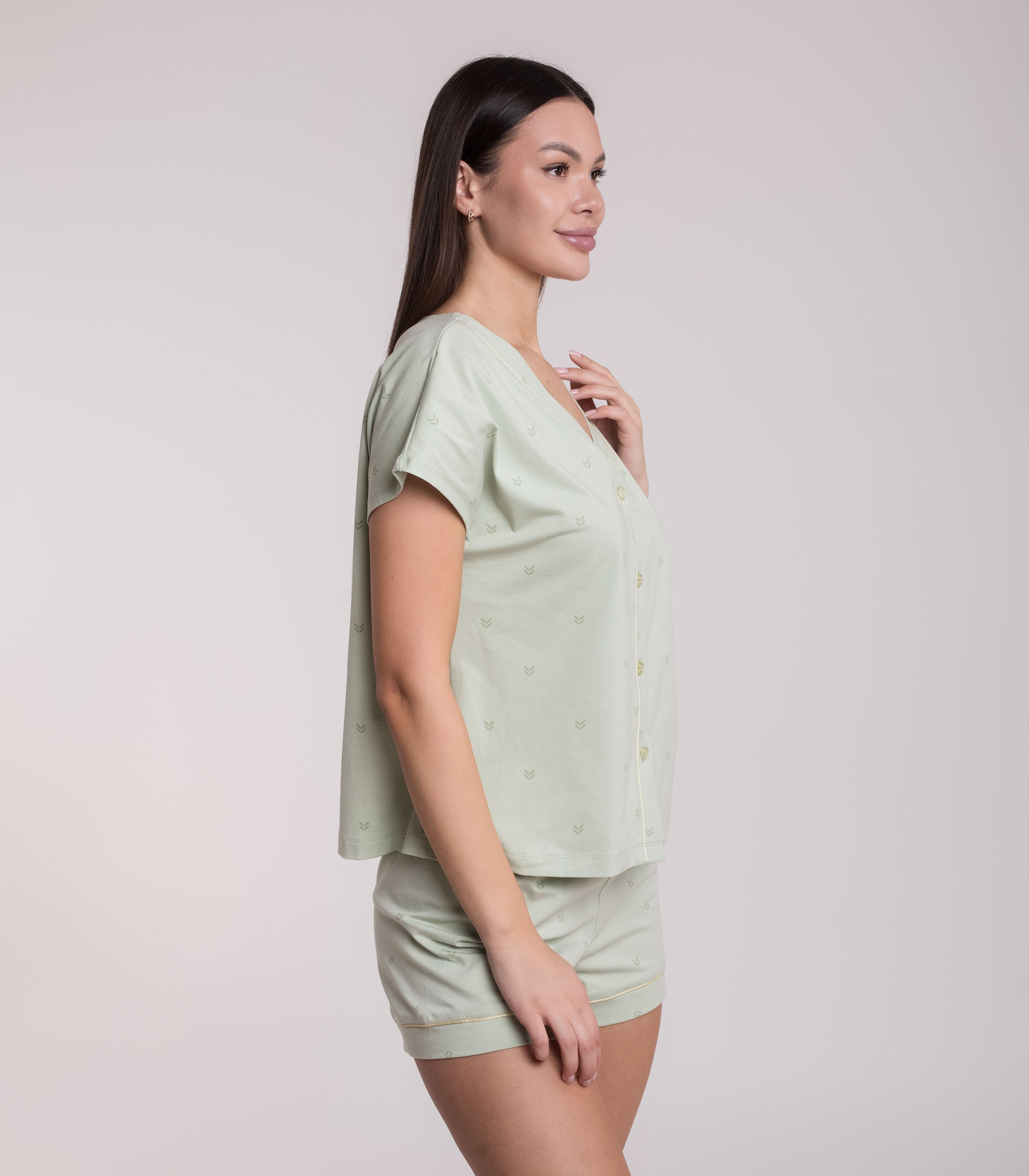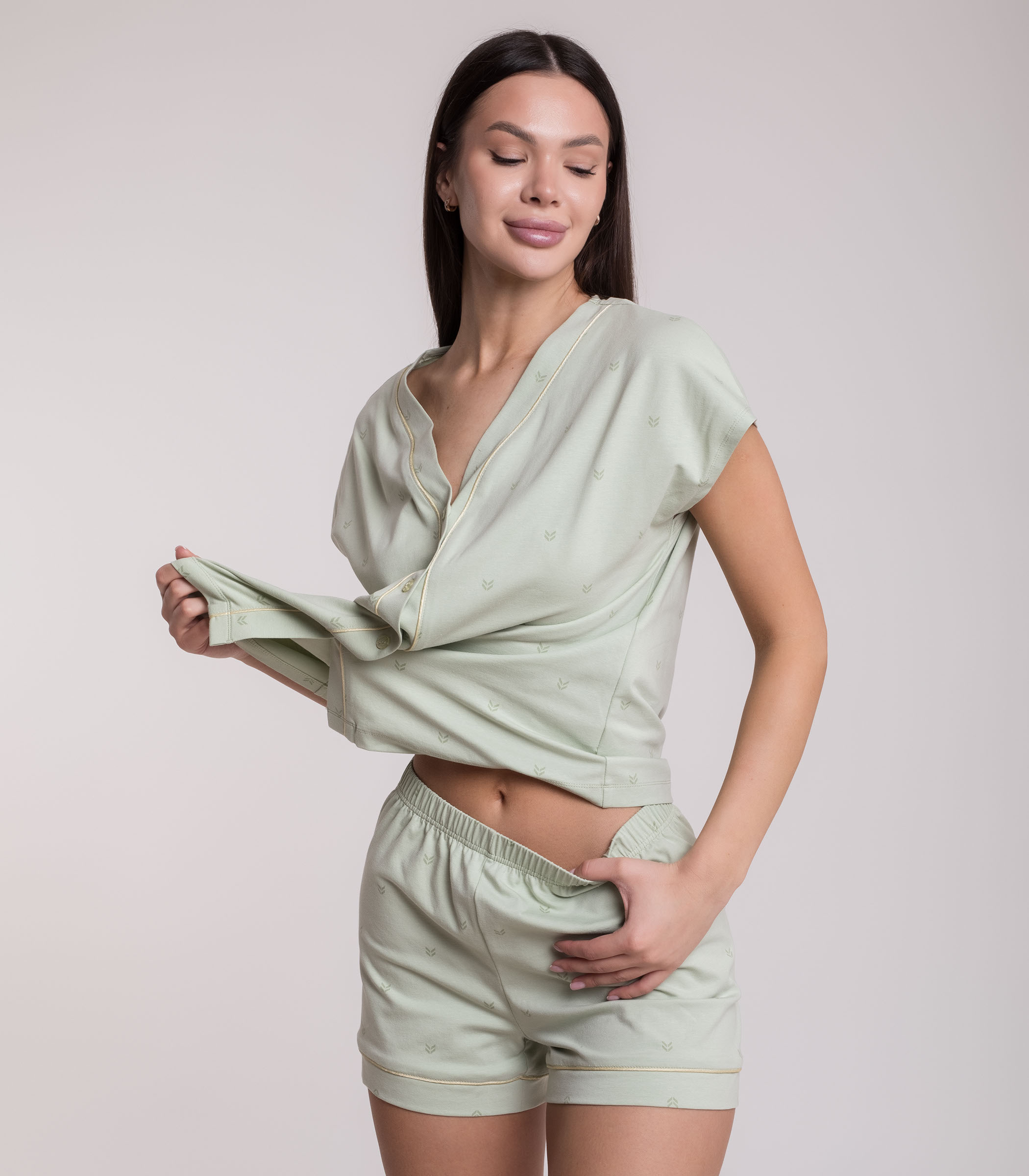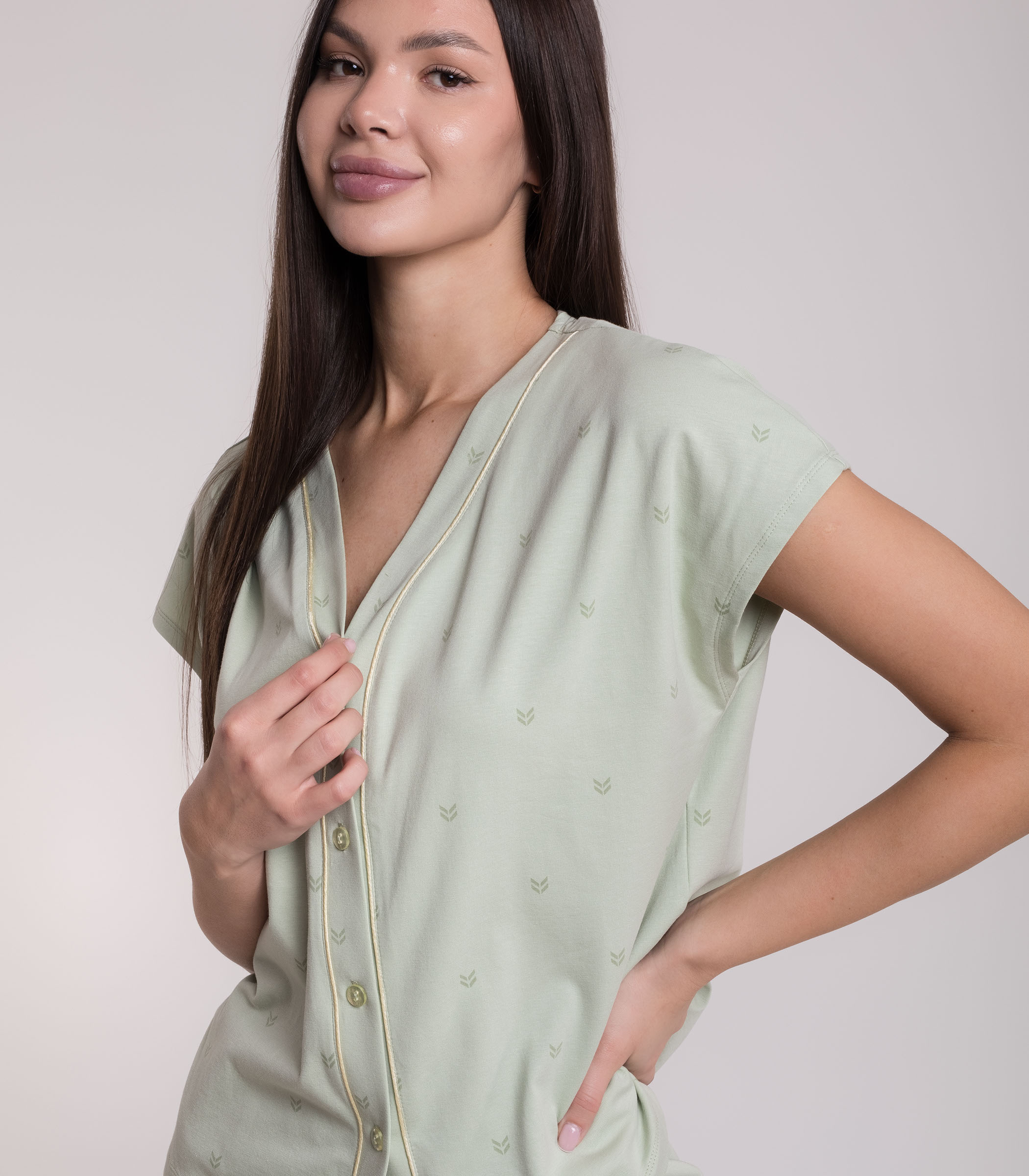 Комфортный комплект для домашнего отдыха выполнен из мягкого хлопкового полотна. Джемпер с коротким рукавом на пуговицах. Мини-шорты с мягкой резинкой на талии. Модель с контрастным кантом.