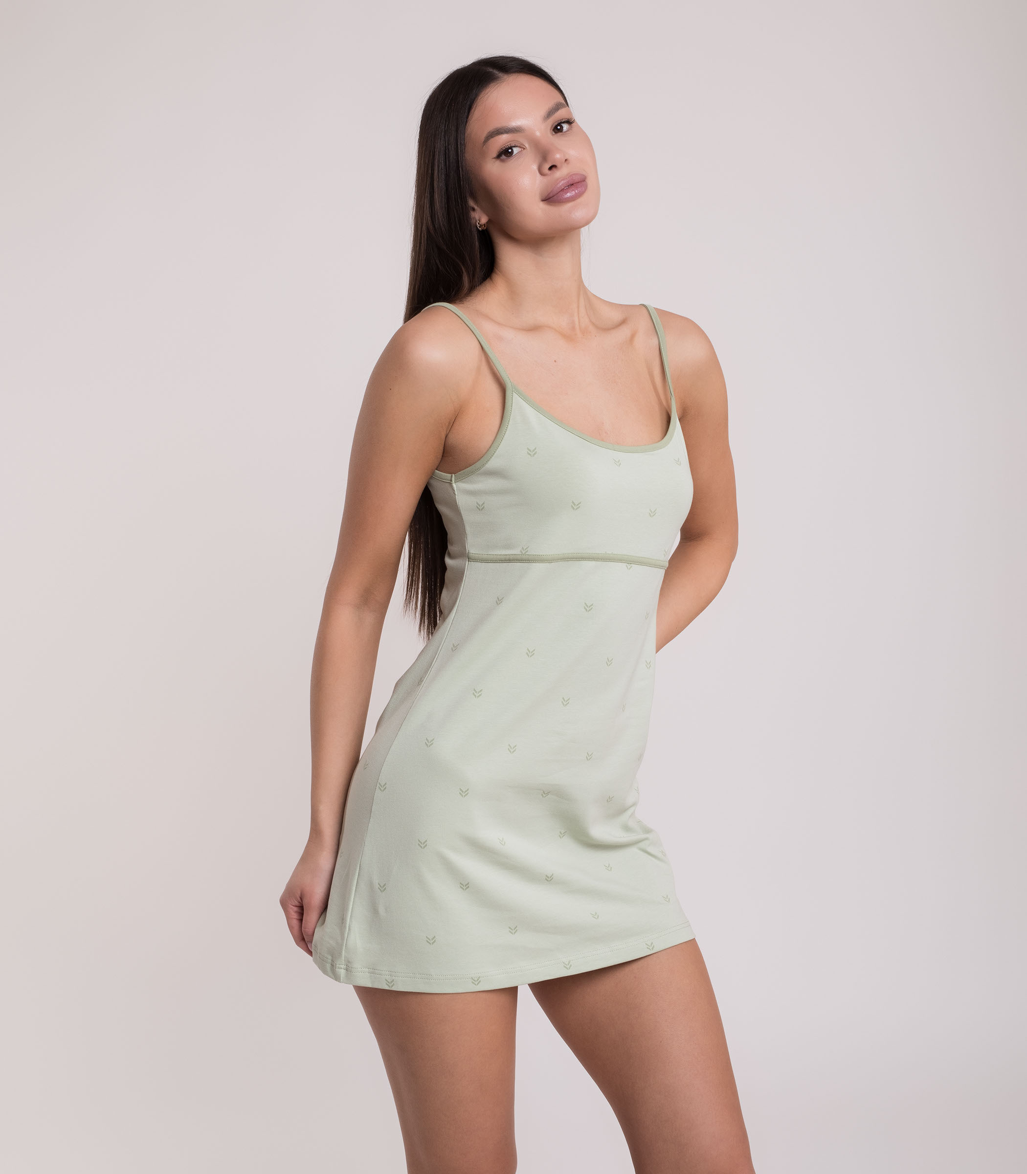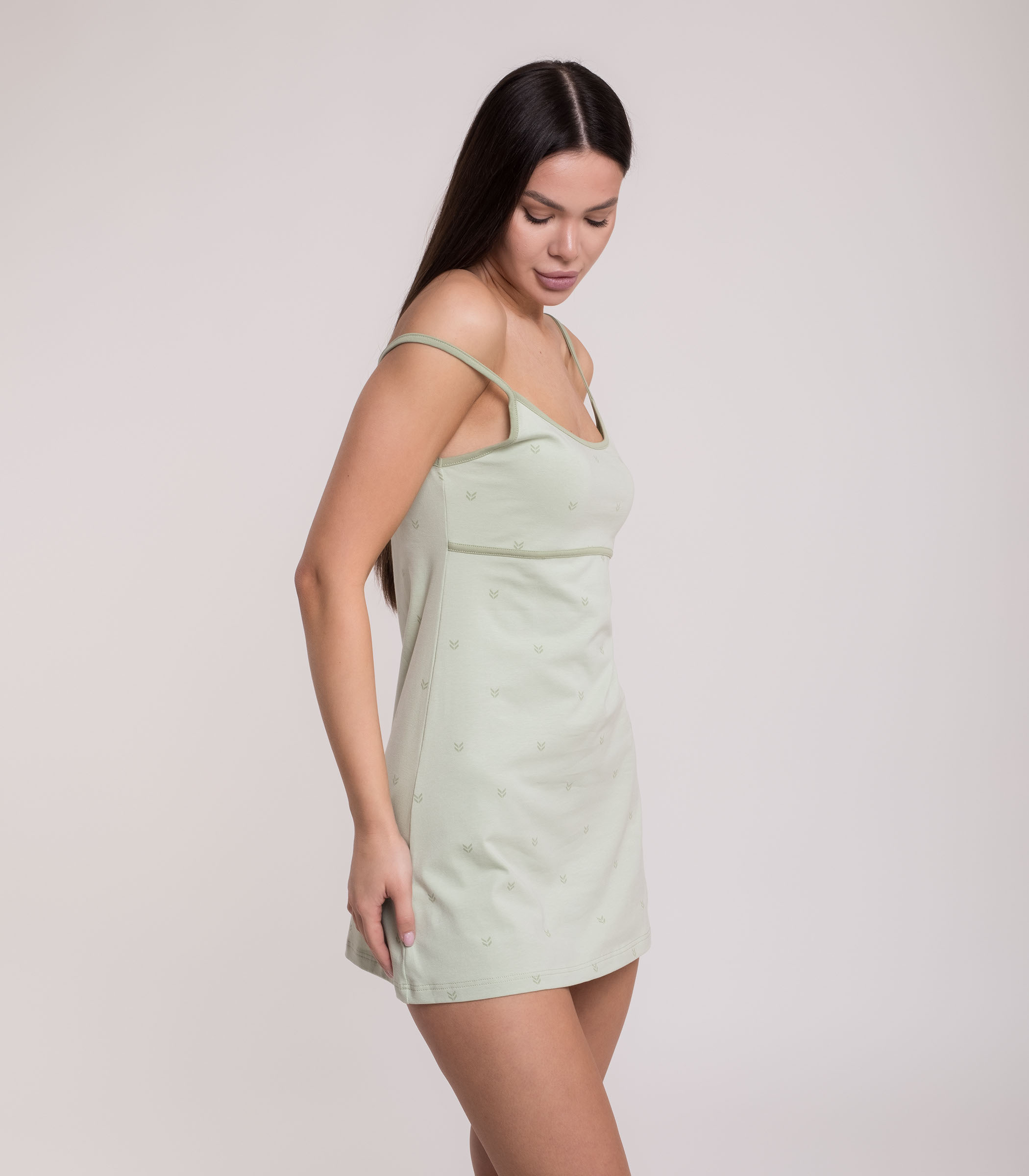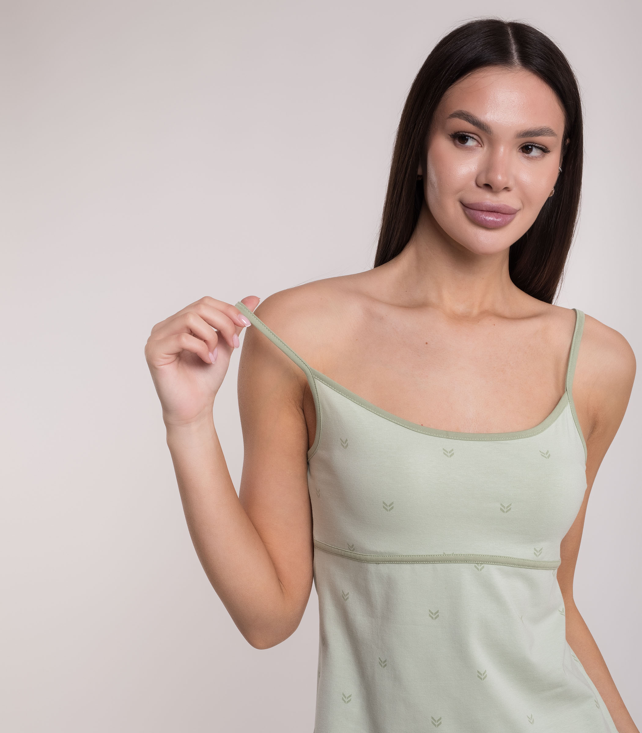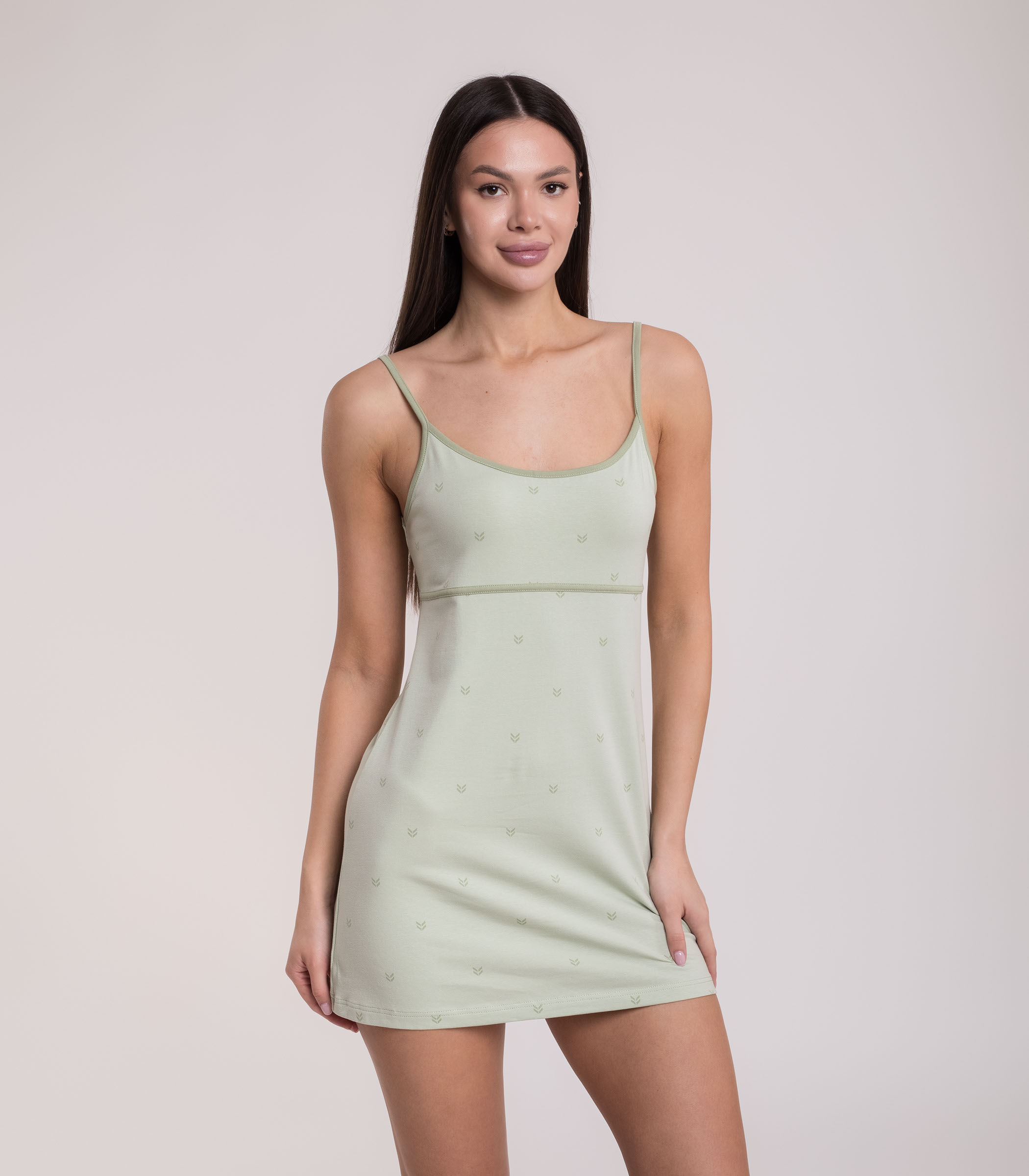 Утонченная ночная сорочка выполнена из мягкого хлопка с добавлением эластана. Модель приталенного силуэта на тонких бретелях. Сорочка декорирована милым бантиком.