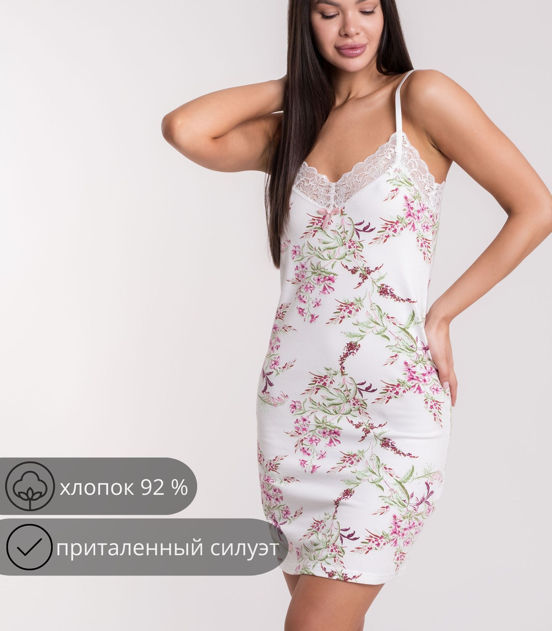 Изящная сорочка выполнена из мягкого хлопкового полотна с добавлением тончайшего кружева. Кружевная отделка и тонкие бретельки придают сорочке легкости и романтичности. Модель отлично подходит для сна и домашнего отдыха.;