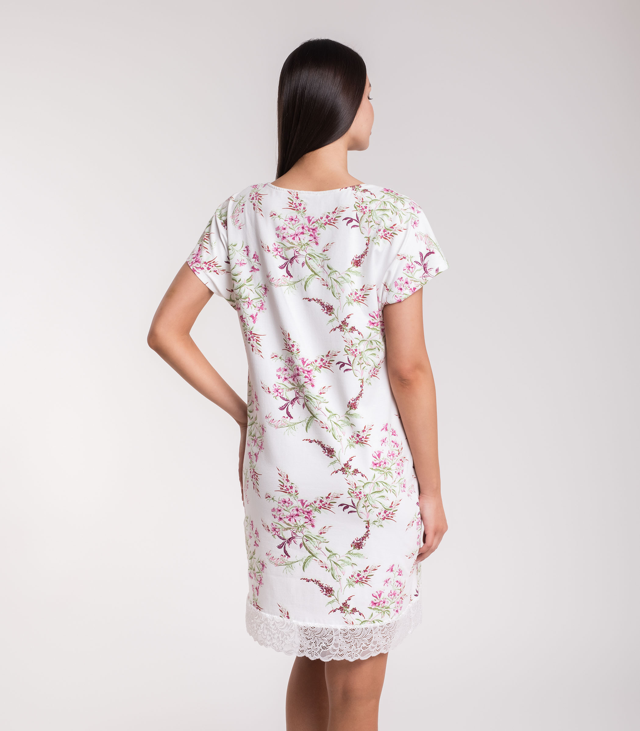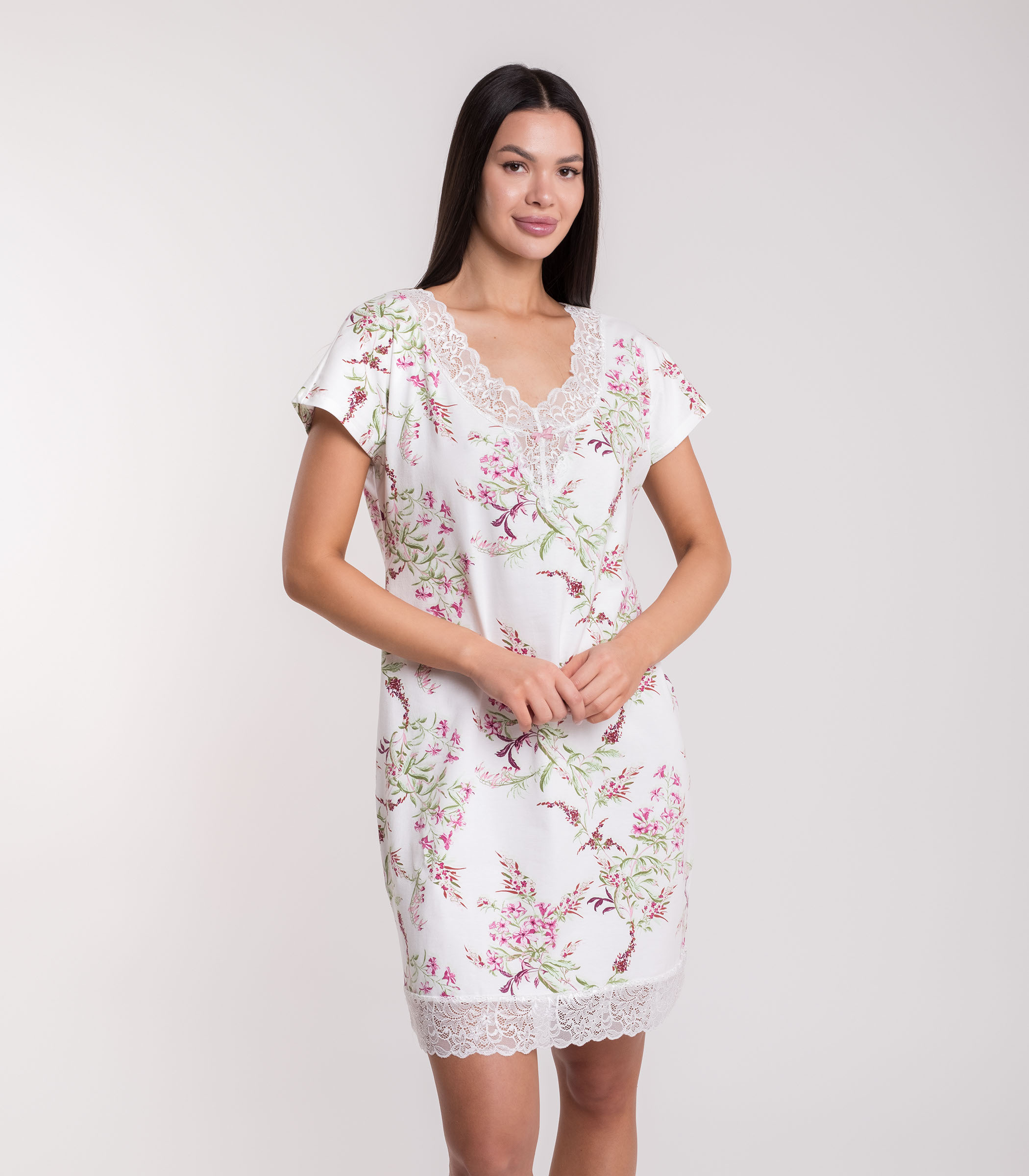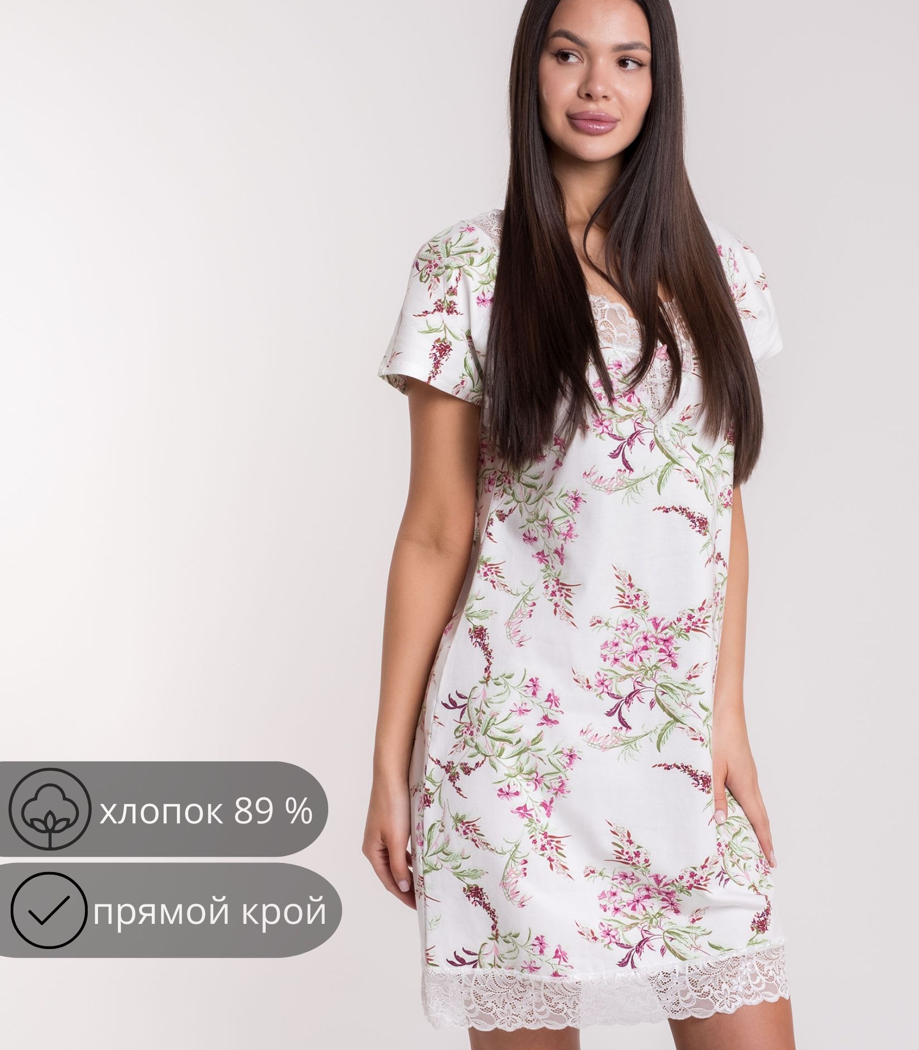 Элегантная сорочка выполнена из мягкого полотна из хлопка. Модель свободного силуэта с коротким рукавом. Зона декольте и низ юбки отделаны ажурным кружевом. Сорочка обеспечивает комфорт во время сна и домашнего отдыха.;