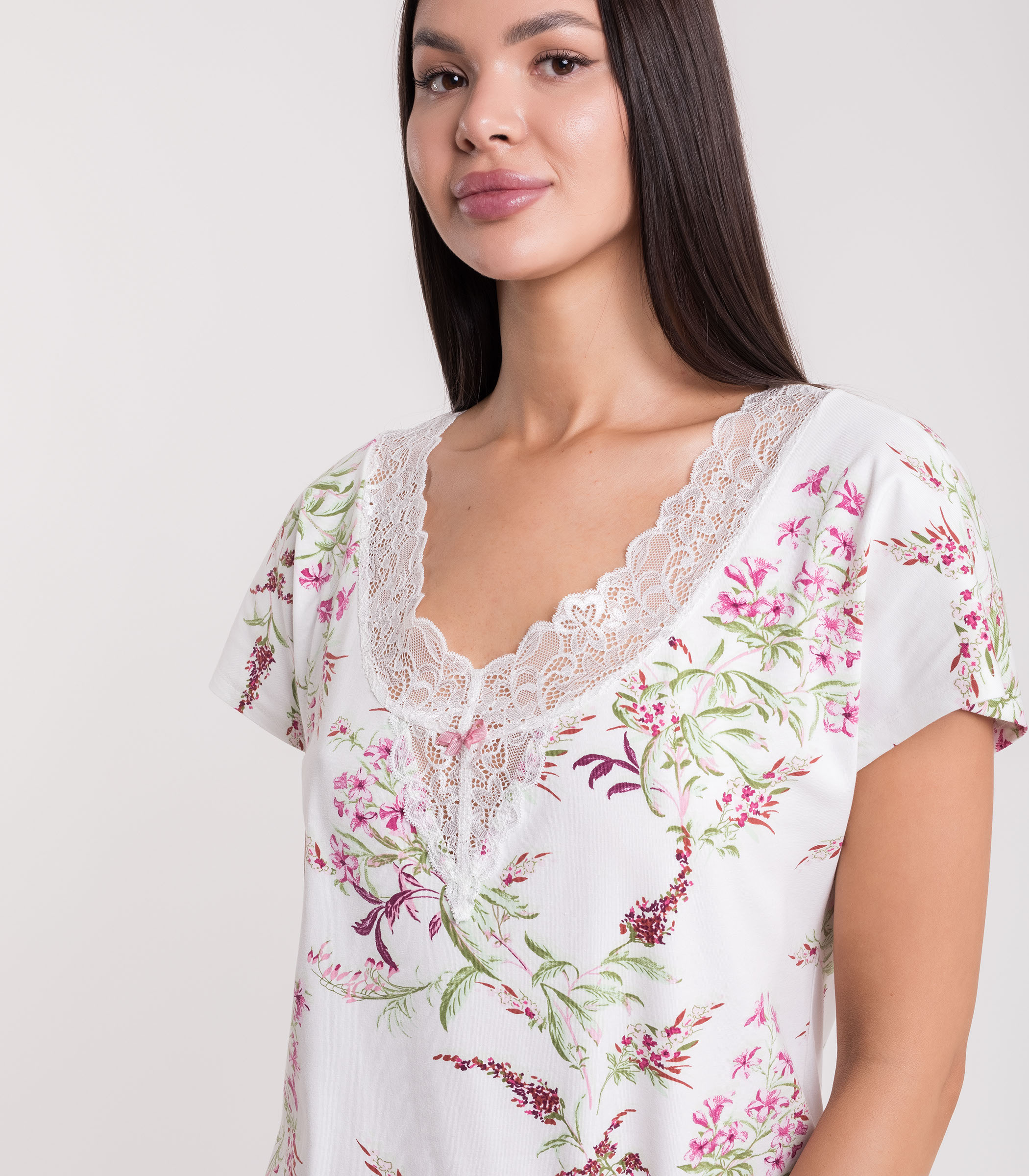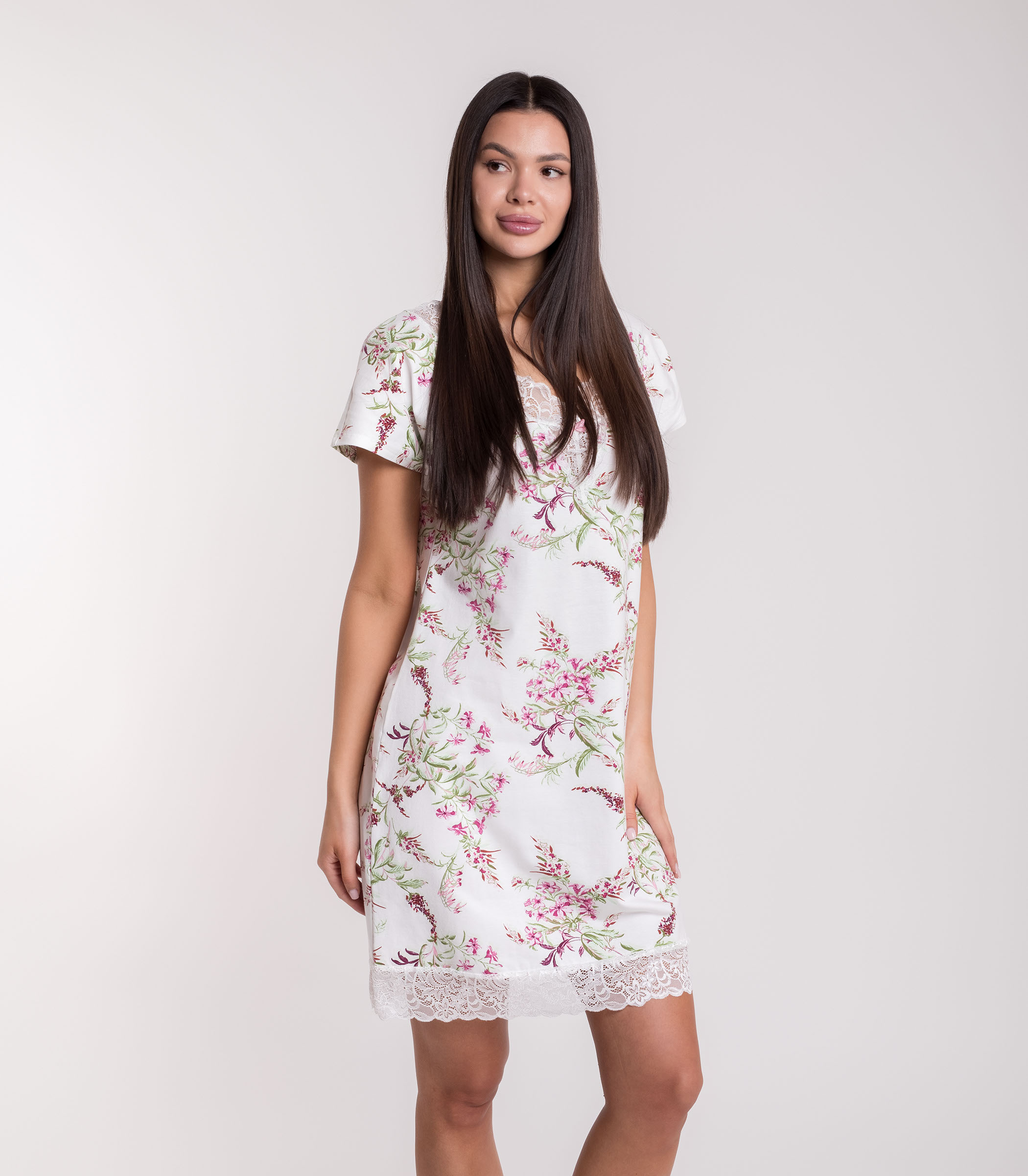 Элегантная сорочка выполнена из мягкого полотна из хлопка. Модель свободного силуэта с коротким рукавом. Зона декольте и низ юбки отделаны ажурным кружевом. Сорочка обеспечивает комфорт во время сна и домашнего отдыха.