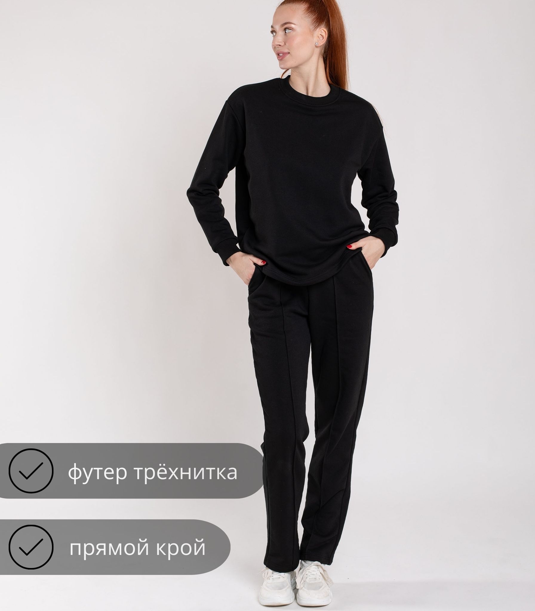 Женские брюки прямого кроя выполнены из футера трехнитки. Модель с удобными карманами по бокам и мягкой резинкой на поясе. Свободный крой и вертикальная строчка на штанинах визуально вытягивает силуэт и удлиняет ноги.