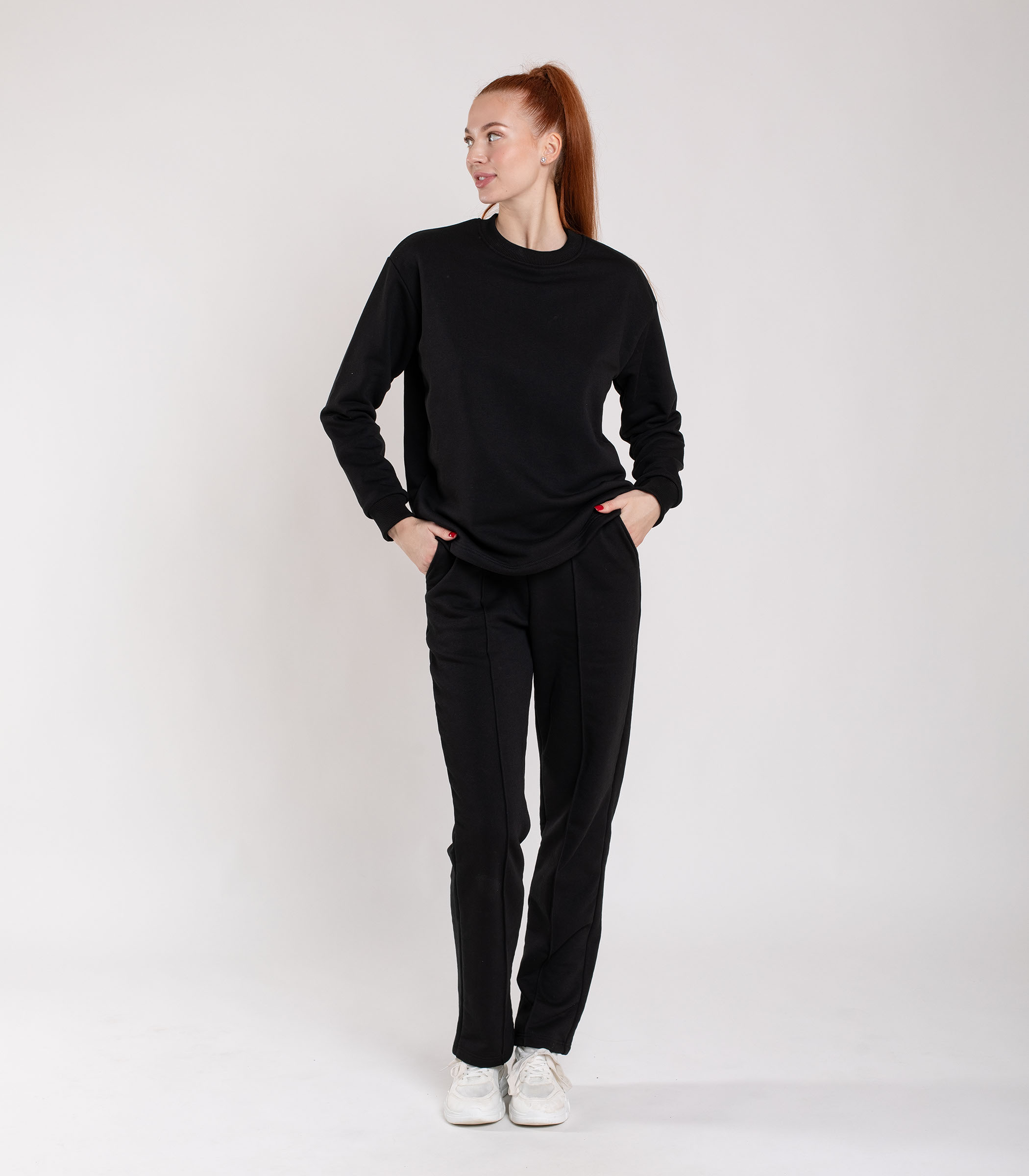 Женский оверсайз джемпер выполнен из футера трехнитки. Модель с круглой горловиной и длинными рукавами на манжетах. Джемпер отлично вписывается в базовый гардероб и хорошо сочетается как со спортивным, так и с повседневным стилем.