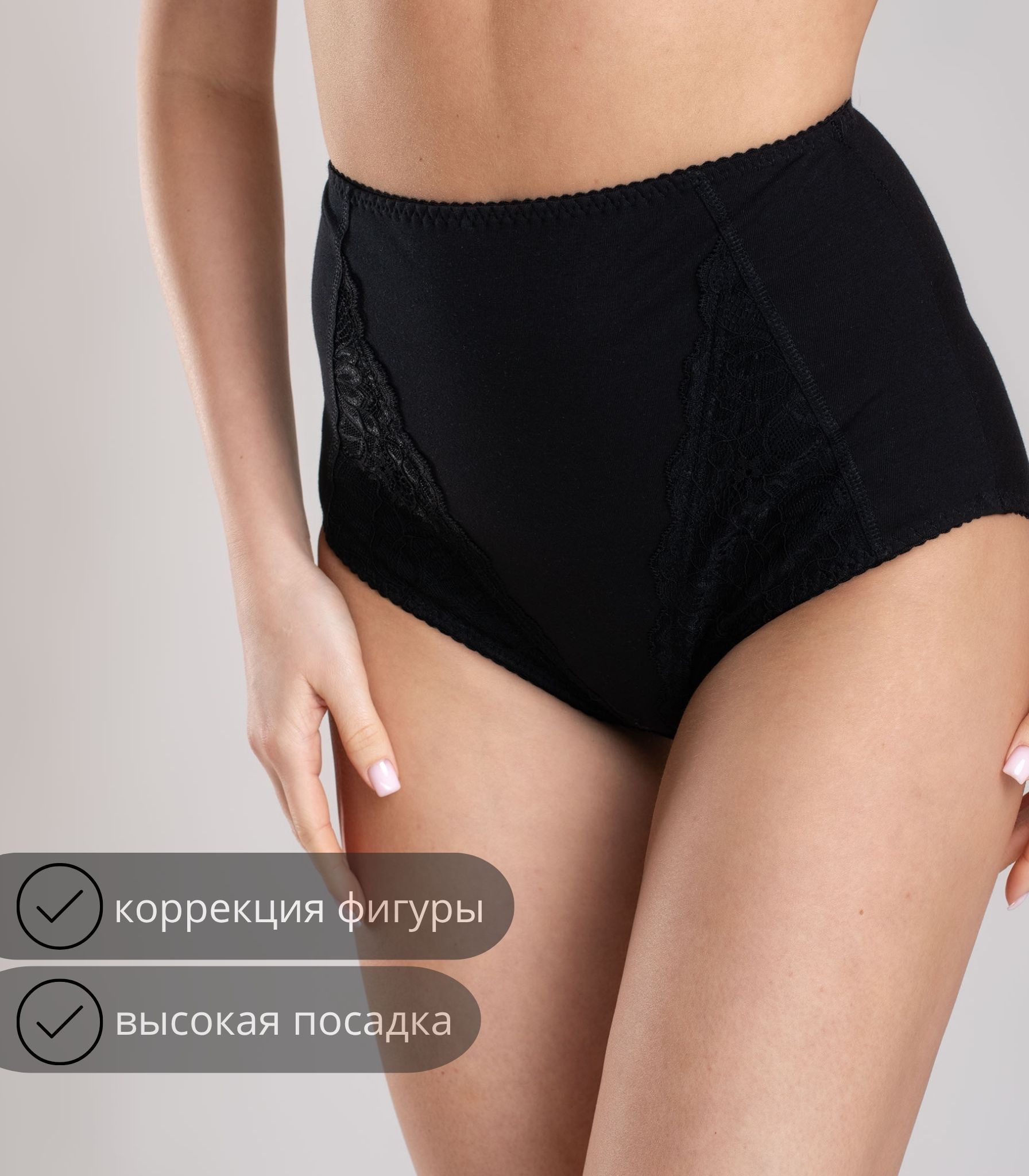 Корректирующая модель трусов с завышенной талией. За счет эластичности и нежности полотна белье комфортно сидит на фигуре и не сковывает движения. Хлопковые трусы дополнены ажурным кружевом.