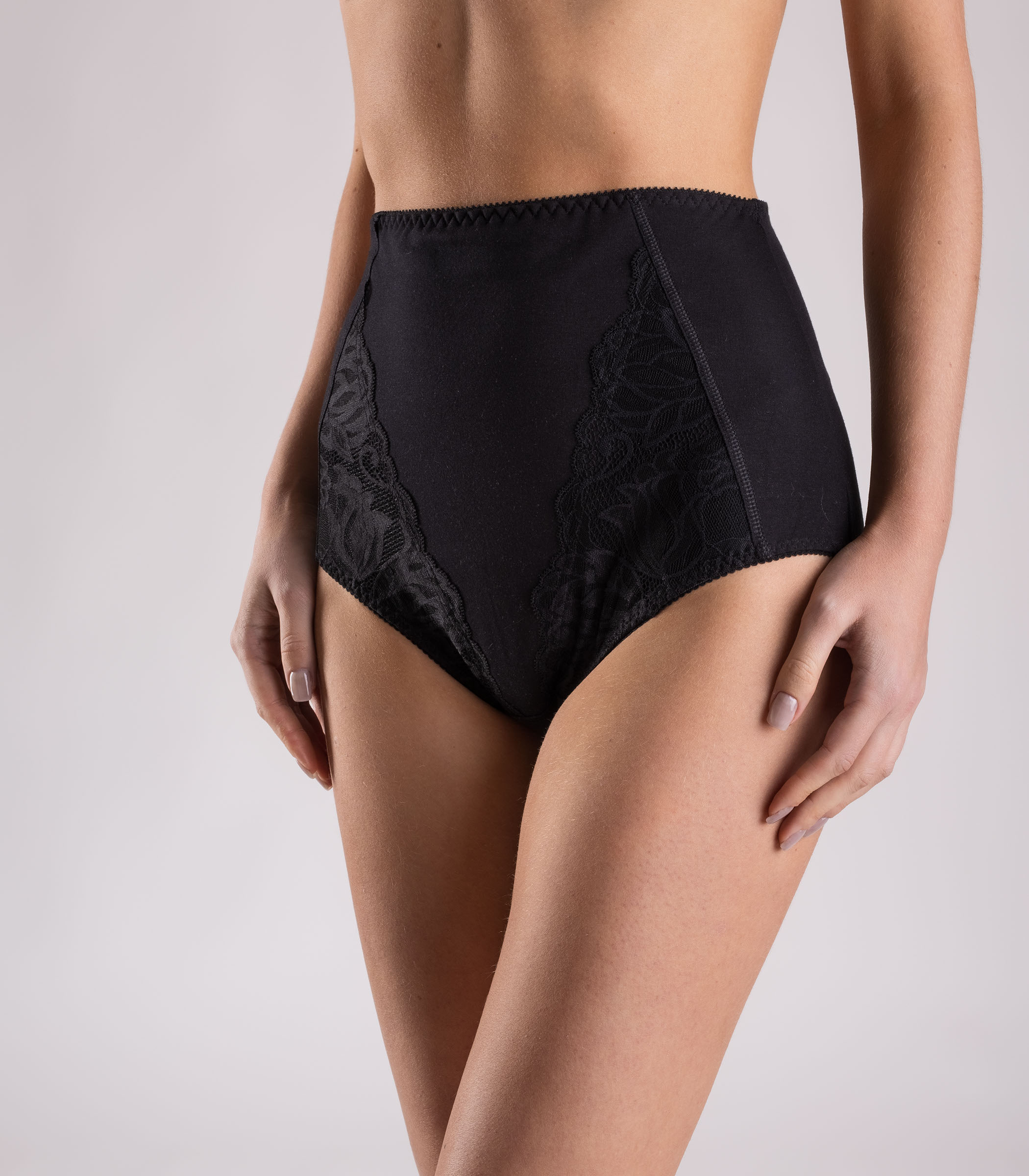 Корректирующая модель трусов с завышенной талией. За счет эластичности и нежности полотна белье комфортно сидит на фигуре и не сковывает движения. Хлопковые трусы дополнены ажурным кружевом.