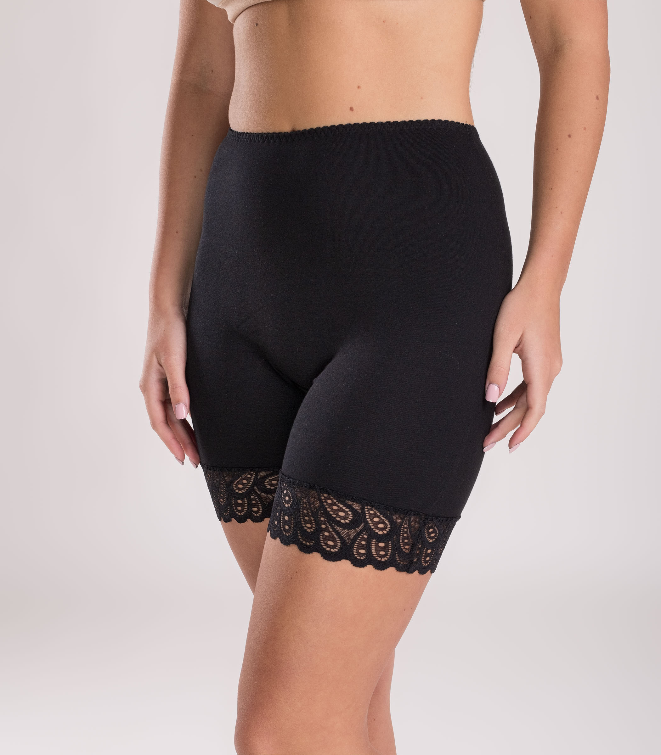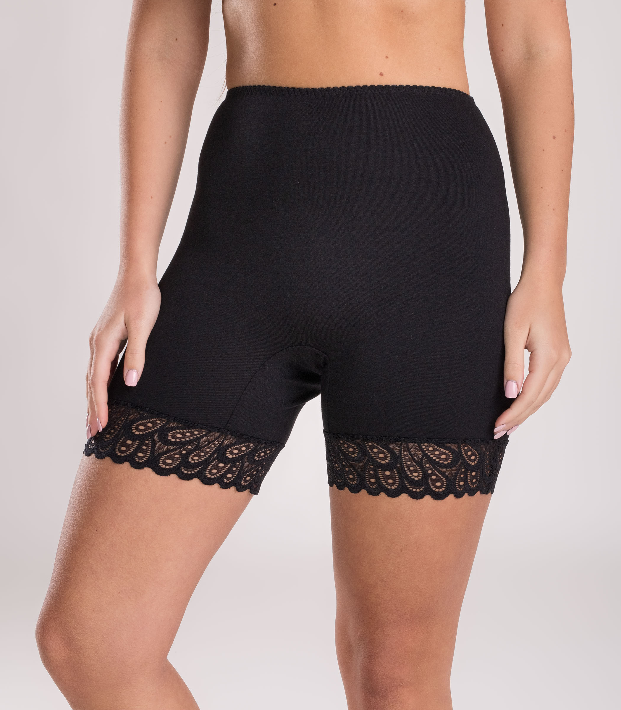 Трусы-панталоны женские на высокой посадке с закрытой поясной резинкой выполнены из хлопкового полотна с добавлением эластана. По краю штанины панталоны декорированы эластичным кружевом, что позволяет аккуратно облегать любую полноту ноги, не перетягивая бедро.
