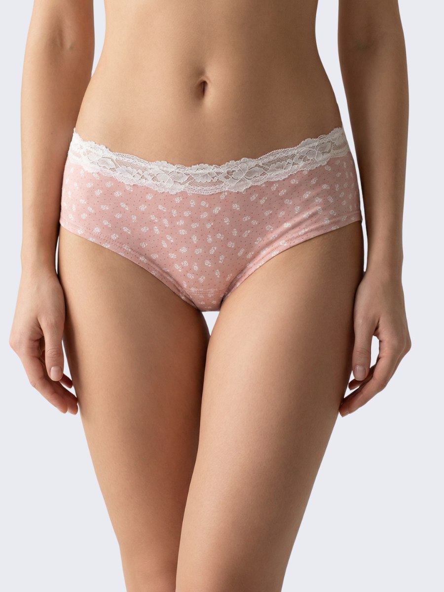Женские трусики-шортики выполнены из высококачественного хлопка с добавлением эластана. Модель на заниженной посадке. Пояс отделан узким эластичным кружевом. На задней детали вертикальный шов.;