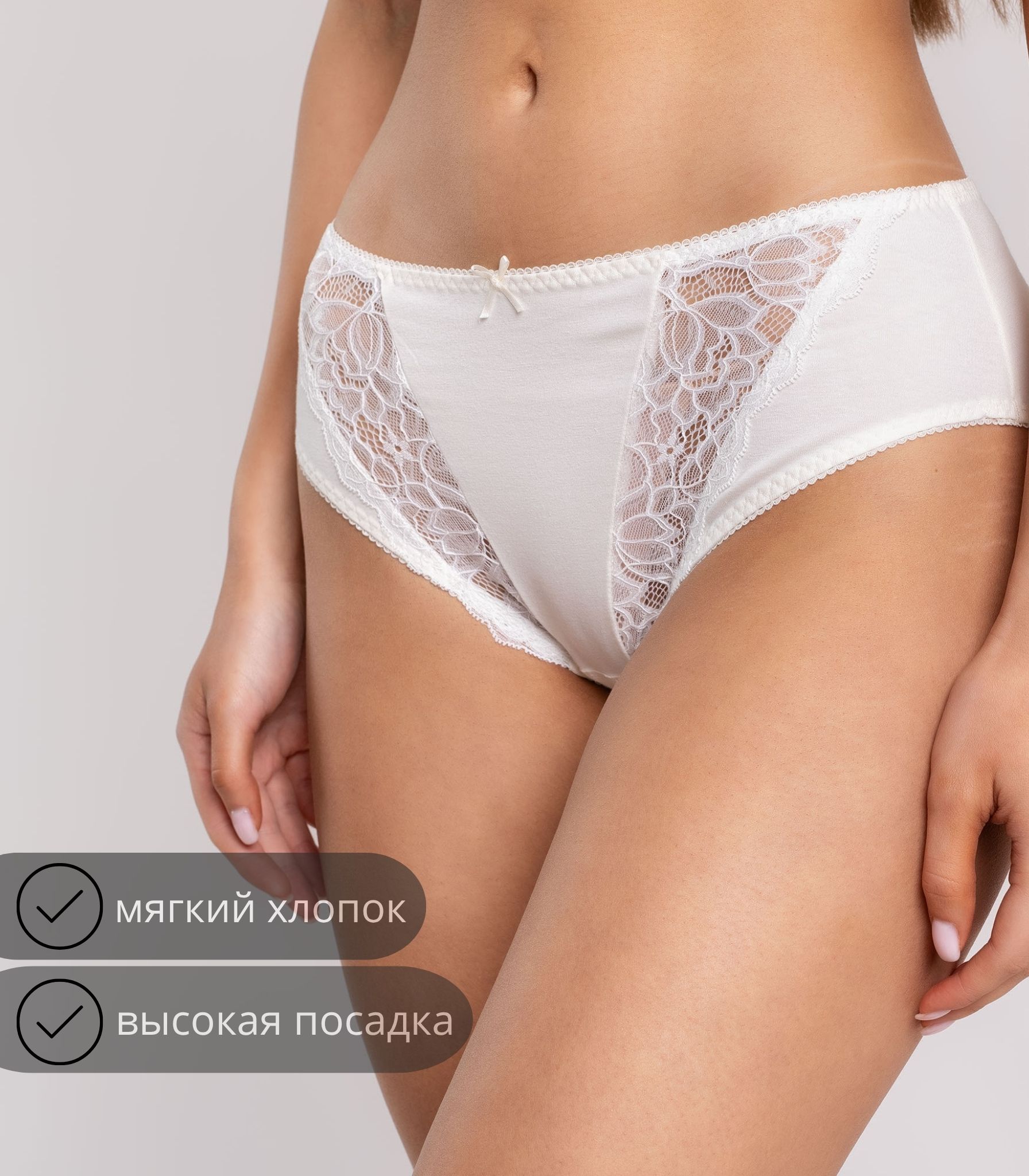 Женские трусики-слипы из высококачественного хлопка на завышенной посадке. Передняя деталь декорирована кружевом и бантиком.