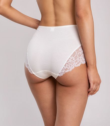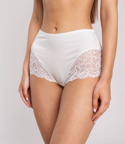 Комфортные трусики-слипы выполнены из высококачественного хлопкового полотна. Модель закрытого кроя на высокой талии. По ножкам ажурные кружевные детали;