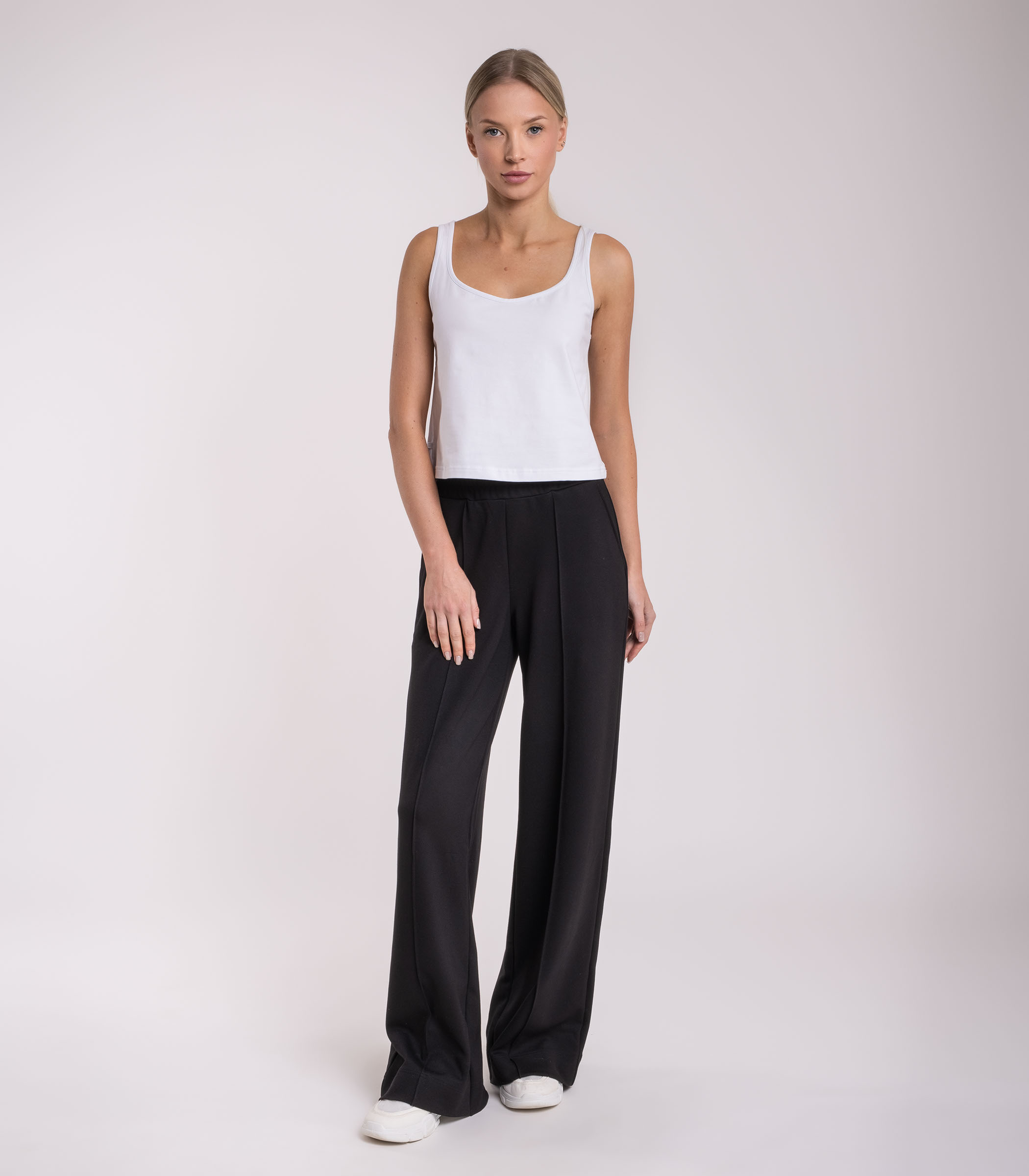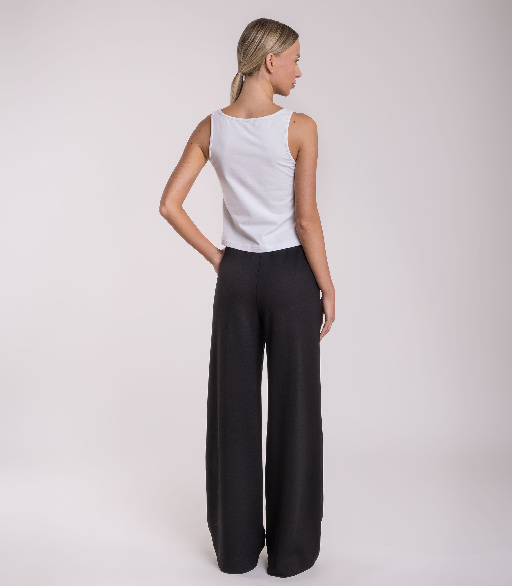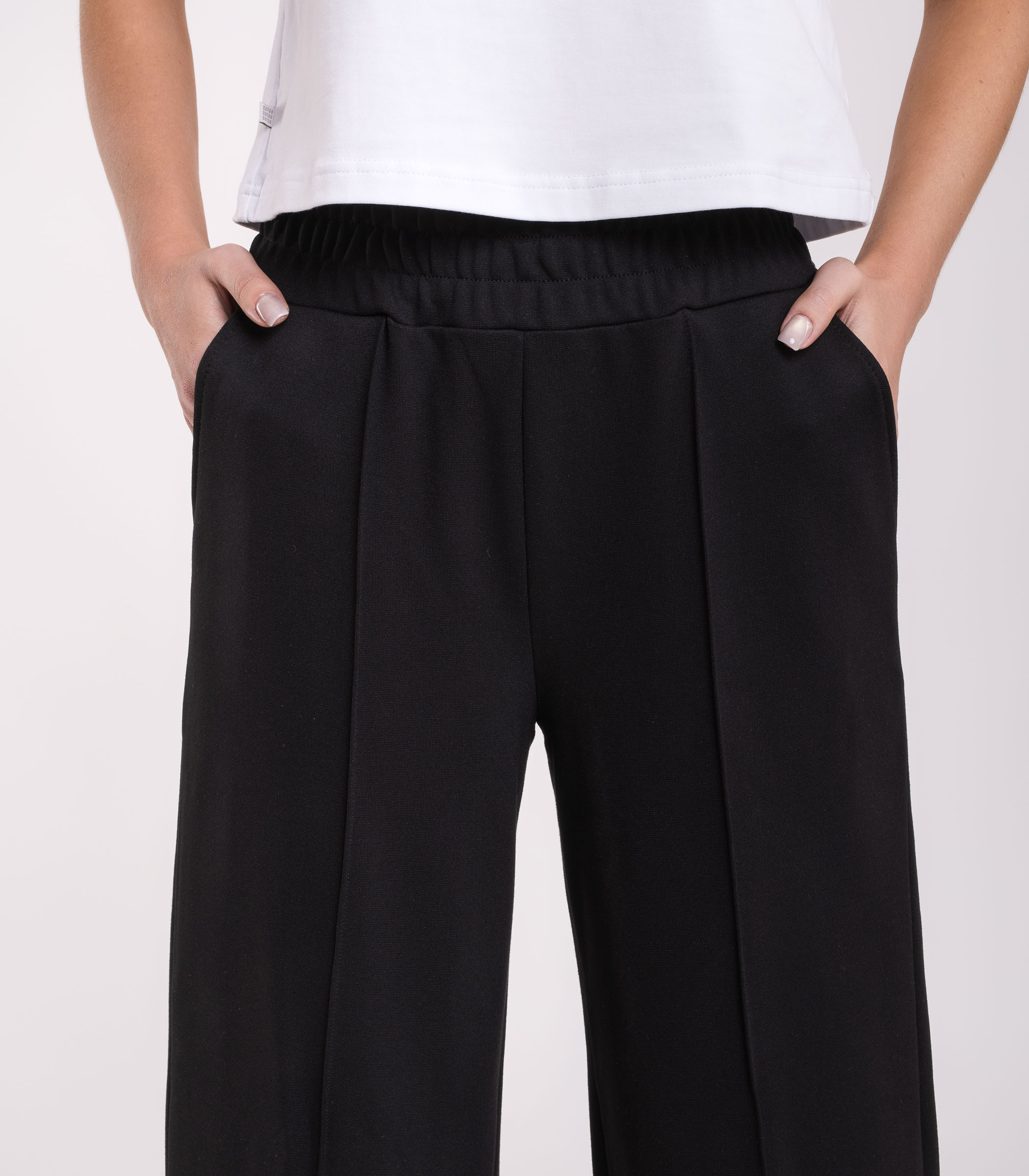 Брюки-палаццо с завышенной посадкой на талии, простроченной стрелкой, удобными боковыми карманами и поясом на широкой резинке. Эффектная модель идеальна для уличного стиля и удобна для носки дома.
